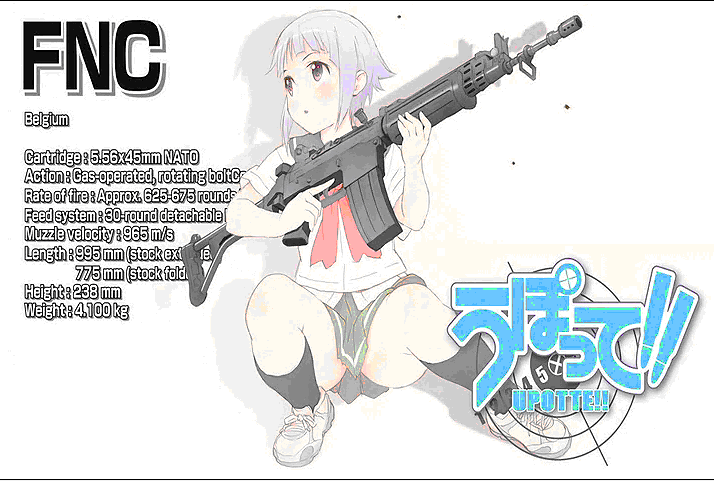 枪支拟人化自然充满吐嘈点和各种二次演绎的可能。FNC,对于只知道AK和M16的外行开说确实是没有听到过,但是看到FNC在《军火女王》里露过脸于是觉得FNC可能真的很受欢迎吧。首先是这个枪械的拟人化设定初看真是摸不着头脑甚至难以接受,因为难以想象。但是就像那句名言说的那样,”一旦接受了这个设定,还挺带感的“,所以在这个设定习以为常之后,也就不去纠结其中的不合理了。话说这片子确实科普了不少的枪械知识,特别是AK系列M16和L85系列。突击步枪于萌妹子,虽然有比较大的卖萌成分,但是这种反差的搭配再暗地里能抓住不少人的新。