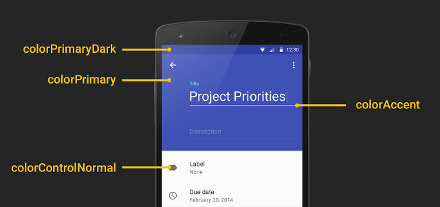 在继承Theme.AppCompat主题之后最为醒目的是新样式的ActionBar,目前谷歌提倡大胆用色,色彩要鲜明等。关于选色可参考Google Design文档中色彩的章节。