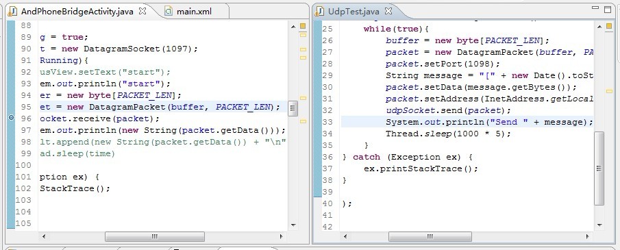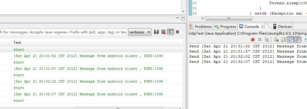 上图左侧为android代码,实现一个UDP/SOCKET的服务端,监听本地1097端口。右侧为PC端java代码直接向本机1098端口发送UDP数据包。两侧分别启动,在转发关系建立之前,android是不会受到UDP数据包。一旦转发关系1098:1097建立之后UDP服务端就会收到PC端的消息。
