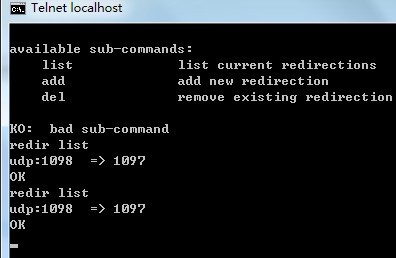 redir add < udp/tcp >:< pc端口 >:< 模拟器端口 >,如redir add udp:1096:1097 redir tcp:1096:1097,作用就是将PC的1096端口转发到android设备的1097端口,当然两个端口号可以相同,因为他们是在两个不同的设备上。但是有个缺点,就是不如adb forward灵活。操作过程如下:
