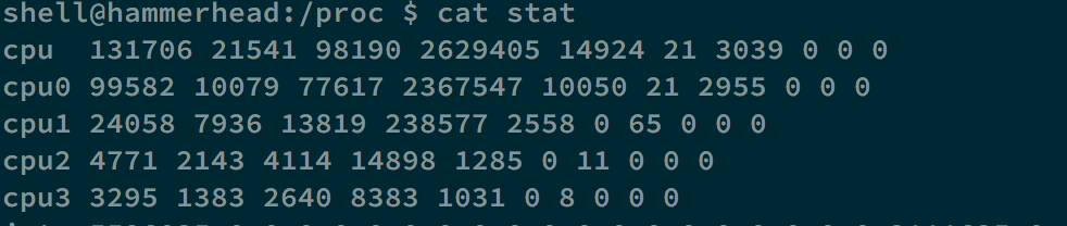 在/proc/stat文件中获取四组数据:用户模式(user)、低优先级的用户模式(nice)、内核模式(system)和空闲处理器时间(idle)。