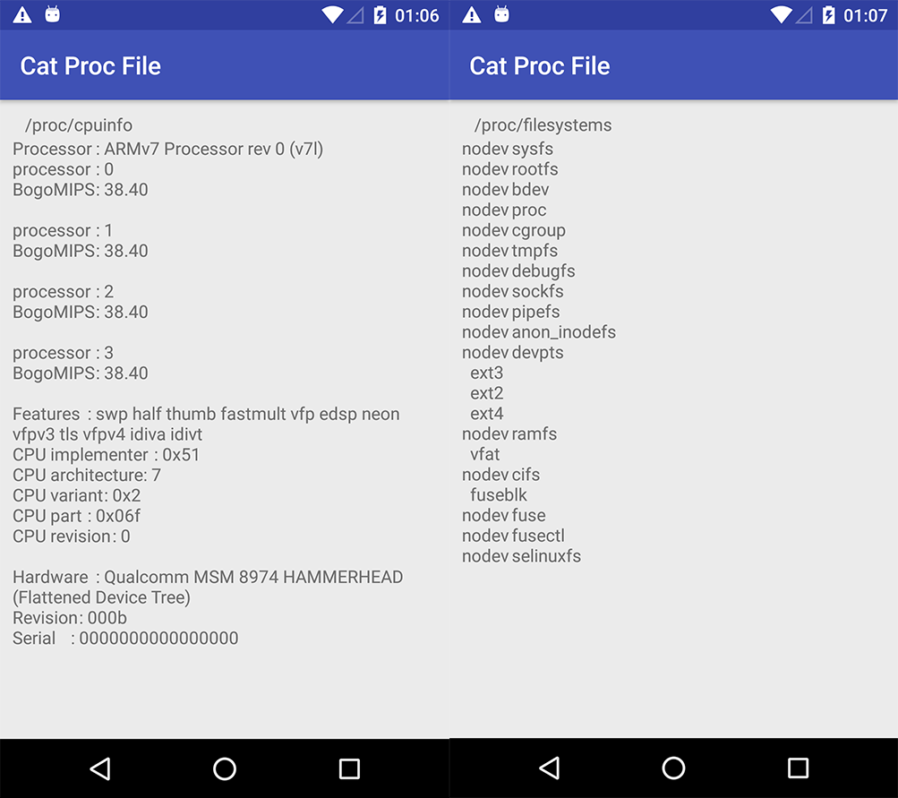 为了快速读取/proc信息这里实现了一个简单的信息读取应用,与其说为了读取信息其更主要的目的是测试在普通应用权限下是否可以读取这些虚拟文件。