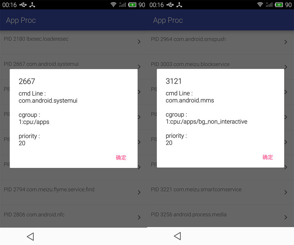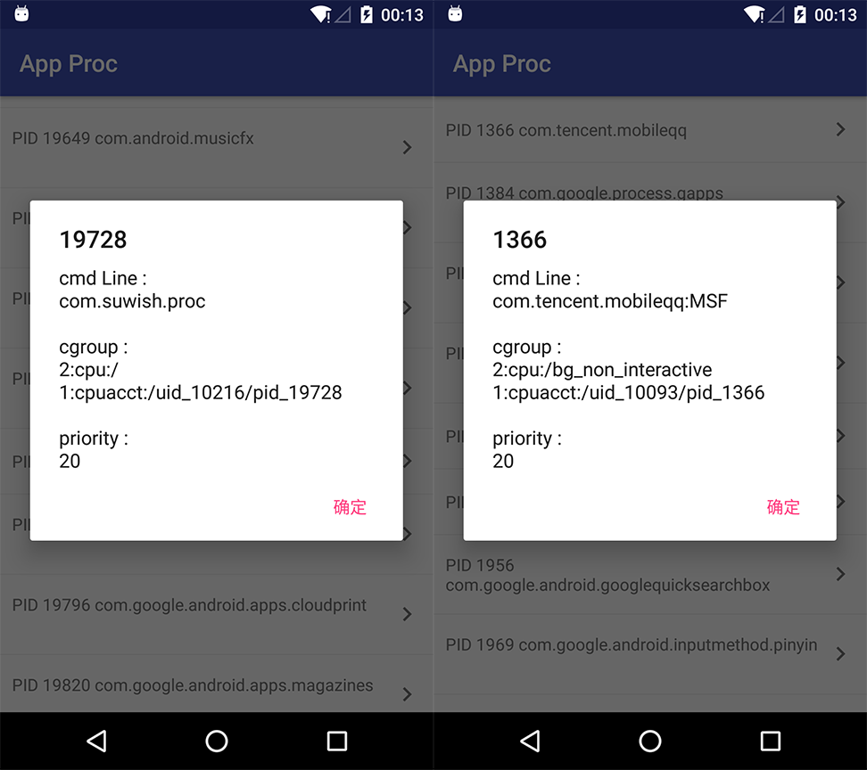 如上图,系统android 6.1,分别为一个前台进程和一个后台进程,可以看出在cpu行中后台进程有bg_non_interactive标识,而pucacct行中份有此进程的uid和pid,这里的pid和uid在使用ps命令时第一列值即为UID,其值是前缀_(uid-10000),第二列为pid(即进程ID),所以我们可以根据ps的值快速定位到proc文件系统,避免对proc中文件的直接遍历。毕竟/proc/pid在实际设备中数量比较大,遍历起来非常耗时,并且很大一部分是后台服务,在ps中根据进程名可以排除大部分不需要遍历判断的进程。