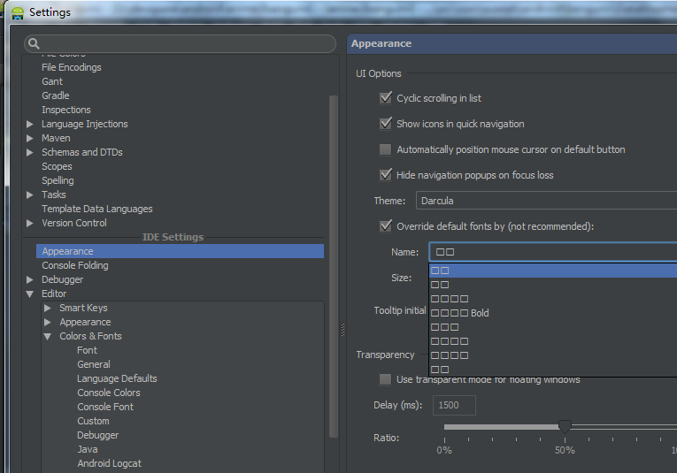 如上图,默认情况下界面所有中文都无法显示。解决起来很简单就是在File -> Setting -> Appeatance中选Override default fonts,就是覆盖掉默认字体。这时时候在字体名中随便选一个方块,重启即可恢复正常,然后选择你喜欢的字体即可,比如微软雅黑什么的。