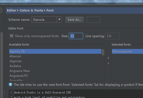 然后就是这个比较要命的情况,在修改编辑器配色方案的时候默认的default实际就是Darula下无法更改字体信息,而字体名的列表直接无法选中,但是双击还有效… …其实我比较喜欢Darcula这个风格,无奈找了个Son of Obsidian风格。