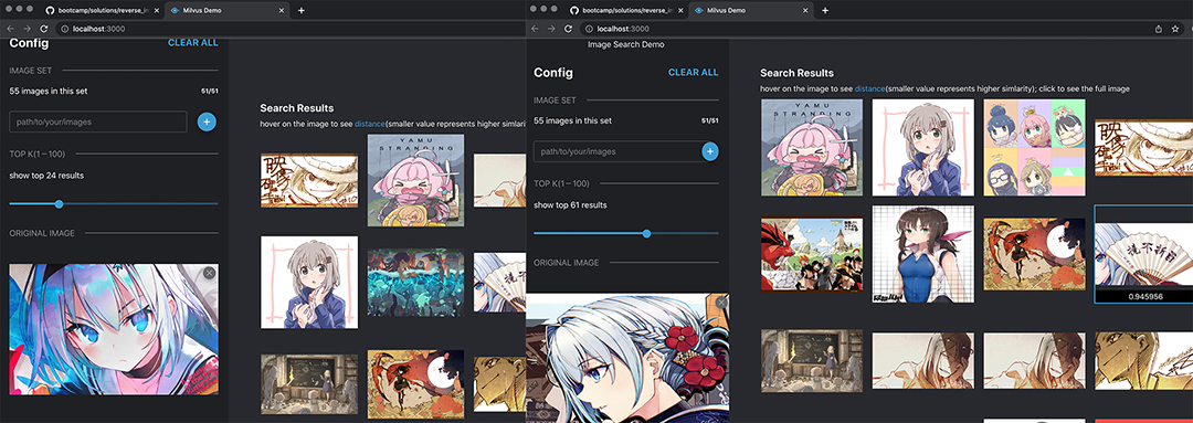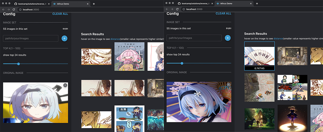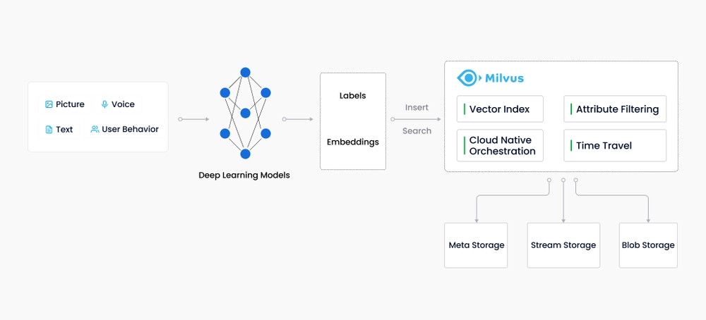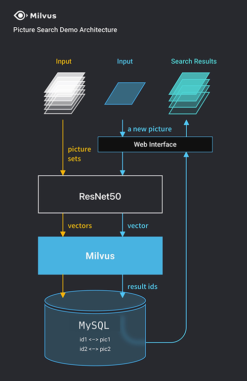 官方的文档给出的适应方式实际上就是 Reverse Image Search 的应用方式,首先做数据信息提取,这里一般用深度学习。然后 milvus 本身做的是存储与数据对比与匹配工作。