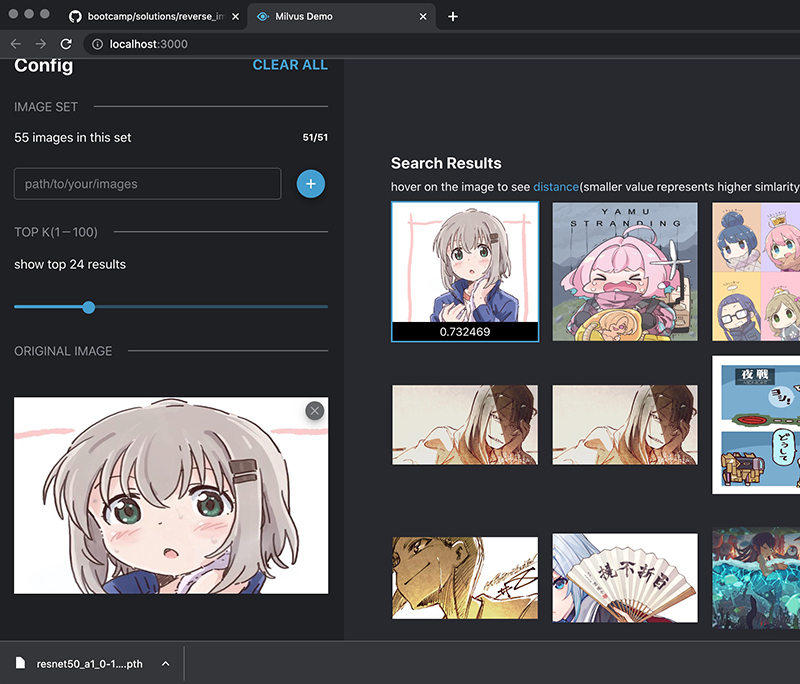 This demo uses towhee image embedding operator to extract image features by ResNet50, and uses Milvus to build a system that can perform reverse image search.