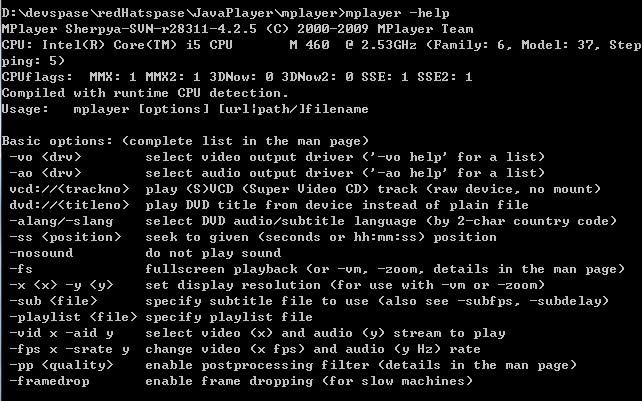 java调用exe,一般适用Runtime.getRuntime().exec()。此方法返回一个java.lang.Process对象,可简单的理解为被调用程序的进程。在mplayer目录使用mplayer -help命令即可看到一些参数信息,如下: