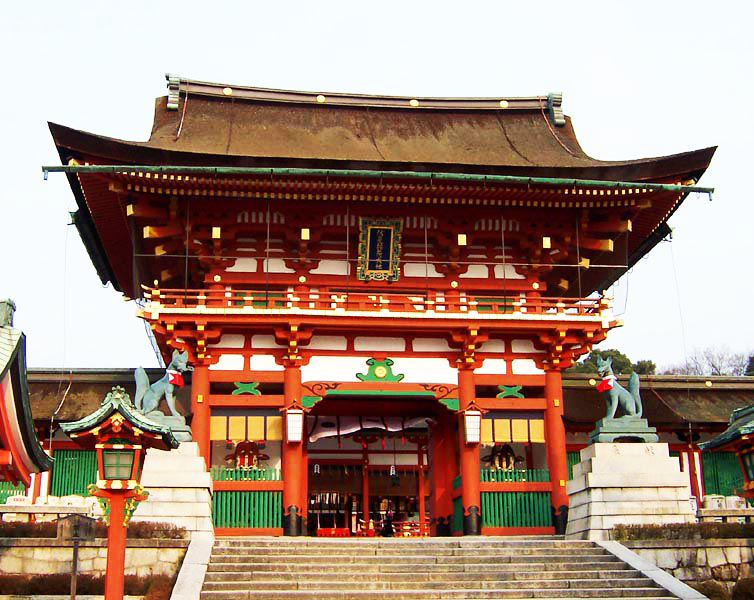 伏见稻荷大社,这是日本四万多所“稻荷神社”的总社,位于京都的稻荷山。伏見稻荷大社主要是祀奉以宇迦之御魂大神为首的诸位稻荷神,自古以來就是农业与商业的神明,除此之 外也配祀包括佐田彥大神、大宮能卖大神、田中大神与四大神等其他的神明。稻荷神的化身代表物就是狐狸,所以很多地方将京都人使用狐狸做象征对象。稻荷不少人甚至直接理解为狐狸面具,实际情况是否属实不得而知。伏见稻荷大社之所以香火鼎盛的最主要原因是稻荷神长官农业和,农业对于古代的意义自然不言而喻,当代在商业的祈福也使 伏见稻荷大社更加兴盛,并且大型企业会对神社进行捐赠,如捐钱修建鸟居一样。经过长期的日积月累就形成了伏见稻荷大社中壮观的“千本鸟居”。千本鸟居的象征也出现在很多电影和动画作品中,据说第一个鸟居由电通捐 赠。