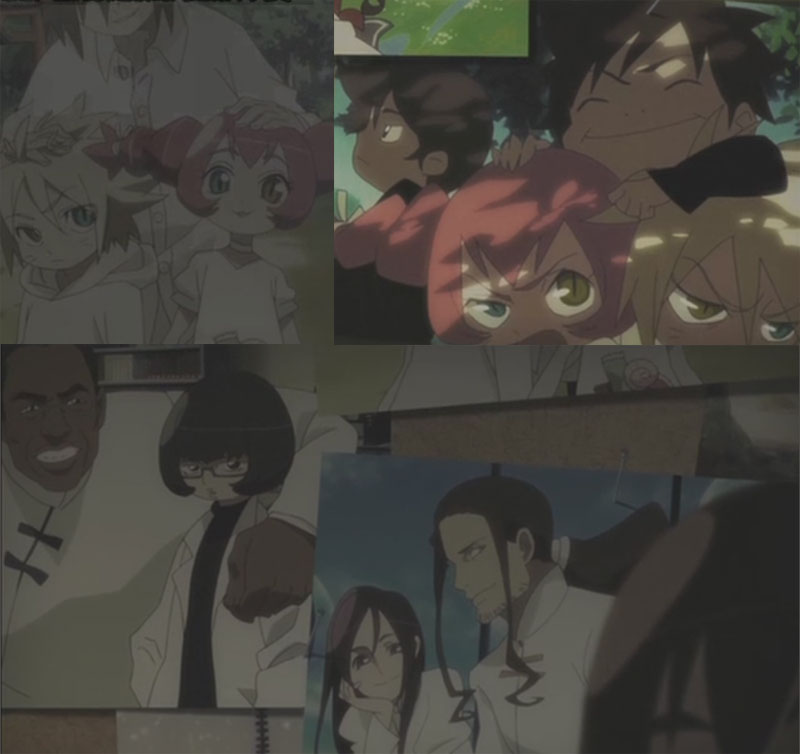 上图为第一话开始的几张照片的截图,左上是稻荷和两个黑白式神,右上为筝的两个式神(阿和吽,红蓝)以及稻荷的两个式神,下面的应该是后面提到的行星统和机关神社的管理人员。之后看到的是带上狐狸面具的稻荷,此时即便带上面具其造型也和之后与幼年时期的筝离别时带上狐狸面具后一样。然后是稻荷在树下自言自语说梦中不可思议的国家什么的,此时稻荷是短发,红色眼睛,穿着也和后文一致。这里稻荷所指的梦中的国家无疑就是镜都了,而目前所在繁华的城市应该就是当前的世界。然后再黑白相间的国际象棋棋盘的地方稻荷带上狐狸面具要离开,对筝说她属于神社的人,这里所说的神社的意思是属于寺庙和科学一侧,相对立的应该是妖怪侧。其间两次神社的特写没有证据暗指某个特别的神社,其它戴面具的“神官”说狐狸收留的“他们”的同胞的意思应该是,筝的眼睛是红色代表她和妖怪有某种关系。稻荷其实也是红色的眼睛,也许这也算是稻荷收留筝的一个原因吧。