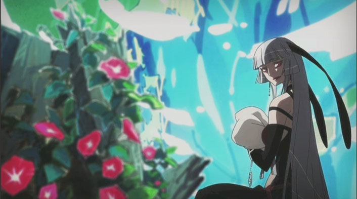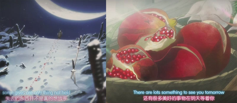 值得注意的是第四话出现的半个石榴(第五话也出现),按照动画的表现手法,这里的石榴流下的红色汁液非常像鲜血。首先石榴在日本文化中其象征意义比较复杂,主要是因为它融合了日本本土、中国文化和佛教三方,所以在没有真实日本文中的体验猜测其意义可能有些偏差。