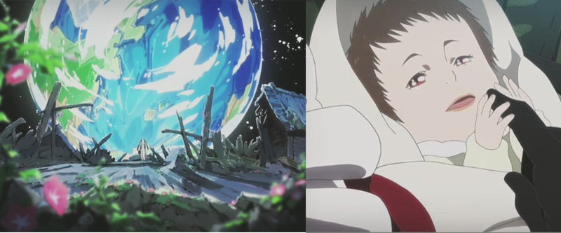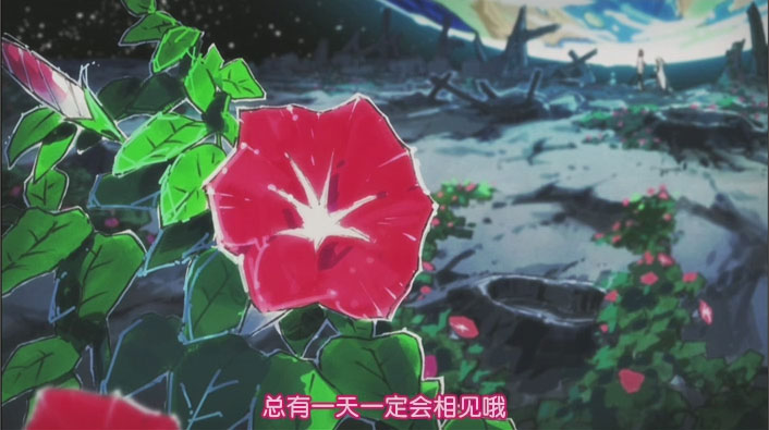 之后突遭变故(不知道什么原因),不过看来原来的住所被毁坏了,个人觉得应该是本话最开始说的:明惠的能力使他遭到周围人的厌恶造成。古都和貌似残破不堪旧居一起移动到另外一个类似于月球的地方,如果和第一话的行星统和机关的设定联系起来,这个也就可以接受了。然后他抱着一个哭泣的婴儿,古都逗了一下就笑了。最重要的是这个婴儿是红色的眼睛,所以可以理解为“非正常人类”,进而推断这个是古都和一代明惠的孩子。