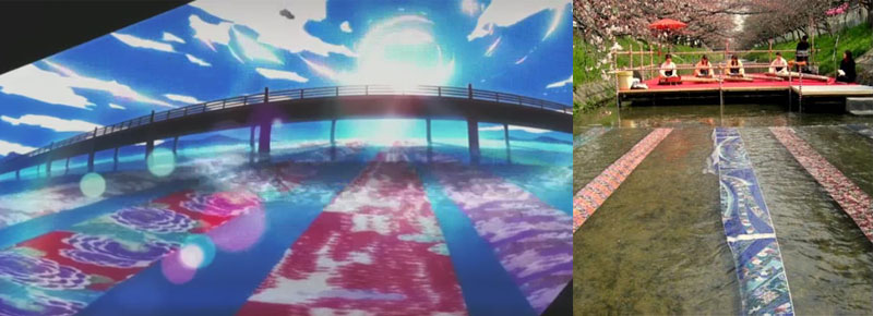 重要的是最后一道工序,可以叫做“友禅流”,也叫“友禅流水”。如若碰巧在金泽、京都等地偶遇有人将布面放在河水中,任其漂动,大可不必惊讶,这就是友禅流水。在水质清透的河川里,为了将布面上的多余胶水和染料冲洗干净。金泽气候相对寒冷,有时也选择冰雪初融,河水最为清澈的时候进行。漂洗时可观赏到各色布料在河川中斗艳的美丽景象,现今由于会污染河水,逐渐转往人工制成的工房流水进行作业。(据说因为担心这个工艺对环境产生不良后果,所以当代“友禅流水”已经相比之下难以见到了)。