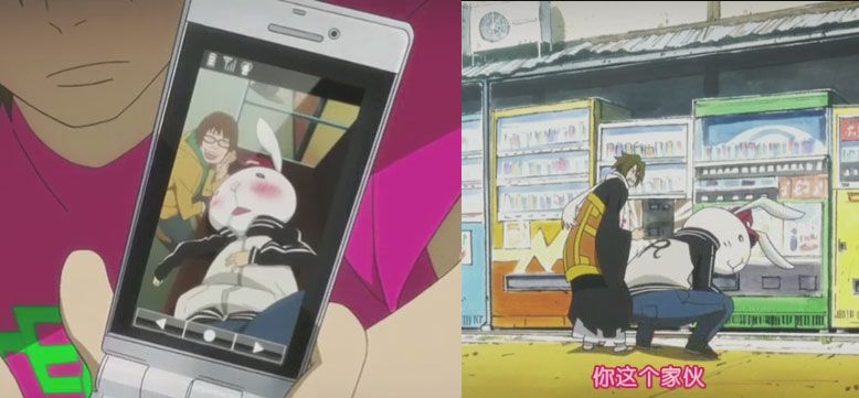最后还有一只兔子从开始就在抢镜头,这个兔子至少出现过三次。首先确定一点,这个本来就是兔子脑袋,不是什么带着兔子大头套。就目前的信息,无法推测出这个兔子的来历。如果回到当初的预告PV,我们也许会看到更多有趣的事情。首先在OVA和系列化TV中都多次出现黑白相间的国际象棋棋盘,首先需要明确的是这个棋盘就是象征着京都,镜都的设定就是京都静止的镜中世界,所以这里的棋盘在没有特殊情况下就是指镜都(在系列第一画中稻荷告别哪里自然不是了)。