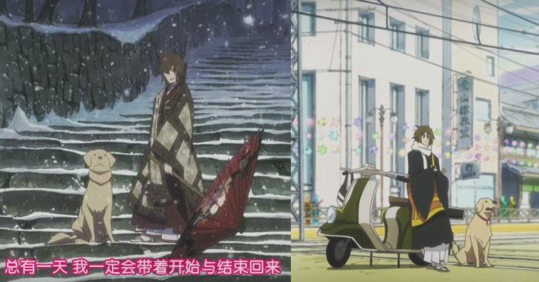 石头(一代明惠 CV 石田彰)再次离家出走… …石头出走时把法号传给二代明惠,二代明惠当时看起来很像《交响诗篇》里的中二豆丁。鞍马和八濑一起聊天说今年的火车又是空的,然后说“擅自抱有期望却又害怕失望”,“但是现在还没有回来”。结合后面引出“忠犬八公”和二代明惠在车站等待来看,这里说的就是一代明惠。一代明惠出走的时候应该是第五话交代的隐居在山中,鞍马、八濑、二代明惠都已经出现,但是还没有长大的时候,结合OVA中翔子向鞍马报告情况时鞍马的回忆可以知道。当时他们三人和古都在一起,二代明惠还是小孩子,在一起哭哭啼啼。然后问他什么时候回来,其实古都也不知道。从这点来说,他们对一代明惠,也就是这个世界真正的造物主到底是什么态度具体是什么也不得而知。不过通过第四话应该是暗示一代明惠已经圆寂,但是稻荷这个角色又让人非常在意。