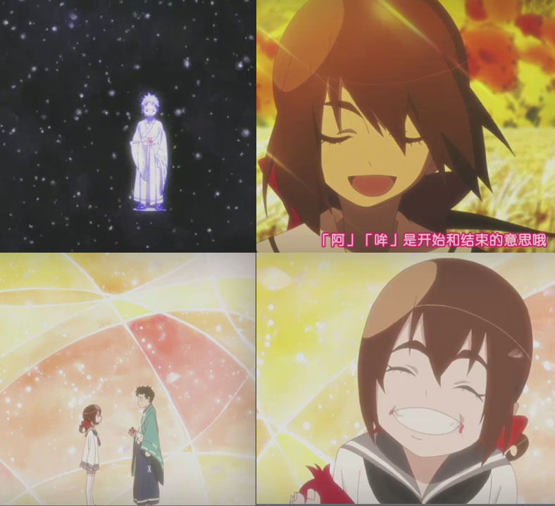 就本动画来说第四话开始二代明惠还是小孩子,字幕打出一代明惠的著名论点之后,说:“吾非拯救后世之人”,二代明惠接着说:“只是,出现于现世的应有之人”,此时屏幕上一直是“明惠上人”四个字。之后是幼年的明惠手里拿着半个石榴,个人觉得这里石榴的意义就是反面的,甚至是暗示着一代明惠已经不会回来了。然后明惠和筝在一起谈论阿吽兄弟兄弟,筝说“阿”和“吽”的意思就是“开始”和“结束”。然后突然最开始二代明惠一个人拿着石榴的黑白画面切换为彩色,他把石榴给了幼年形态的筝,筝把石榴吃掉了。然后明惠说了和第一话筝说的相似的话“无论发生什么,也没什么好后悔的吧(筝)/都会留下遗憾吧(明惠),我坚信我所做的决定(筝)/然后做出决定(明惠)。这一份骄傲一直伴我前行(筝)/以这份骄傲作为动力前行,不论是至今为止,还是从今以后”。这里的石榴比较明显的就是象征团圆,然后明惠说继续选择等待,然后仿佛想通了什么,释怀地笑了。