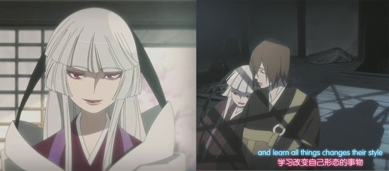 第三话是讲八濑的故事,实际也是妖怪方面的故事。首先,在日本鬼和妖怪的定义与天朝完全不同,鬼属于妖怪的一种。妖怪的原型一般是野生动物,而后渐渐的融入灵,从而发展到目前的地步。这里八濑通过一个小妖怪来观察镜都发生的事情,在旧物回收时筝自问飘走的物品是谁引起的,这时八濑的反问与OVA中三个人“议会”的思想相同,认为筝就是古都,如果是古都,那么自然知道其中的原因。