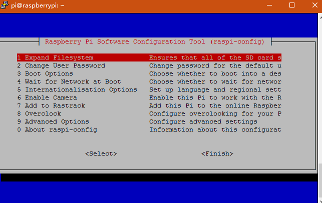 由于在烧录系统时只使用了一部分sd卡分区并将文件系统格式化为fat32,如果使用较大的SD卡,那么会有非常大的闲置空间,这时候需要充分利用整张SD卡空间,那么运行sudo raspi-config