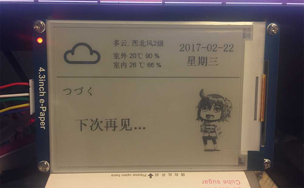 屏幕的问题我从一开始也比较犹豫,其实我最开始的想法是找i一个四寸左右的高分辨率的黑白字符屏幕。但是找了很久也没有合适的选择,后来发现了这款墨水屏,类似于kindle的屏幕显示效果非常好,但是刷新率非常低,而且是全屏刷新,刷一次将近2秒。并且显示图片非常麻烦,但是非常省电,即便断电也能非常好的显示。