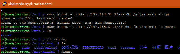 那么树莓派如何利用利用小米路由器这一个T的存空间呢?最有效的是挂载其硬盘,这里使用SMB/CIFS协议来实现,各种细节请参见:《学习Linux,302(混合环境):CIFS集成》