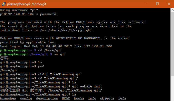 值得注意的是这里因为新建了git用户专门用来管理远程库,所以需要切换到git用户,并在其home下执行上述操作