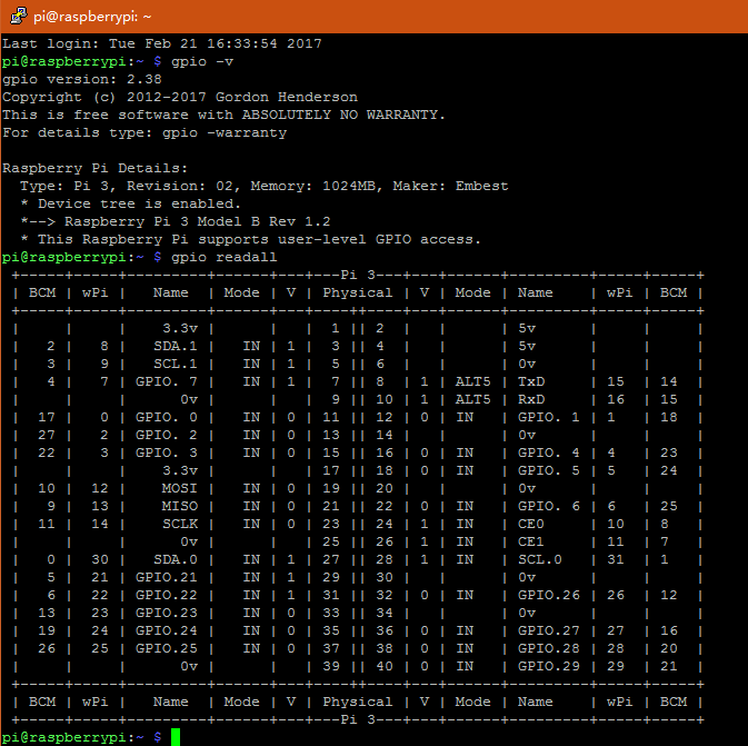首先使用内置gpio命令查看GPIO物理接口信息,如果使用gpio readall命令出错提示不识别板子的话,去官方下载最新的gpio编译并重启,树莓派系统子自带的似乎是2.31,这里更新到2.38之后顺利读取到gpio物理接口信息。