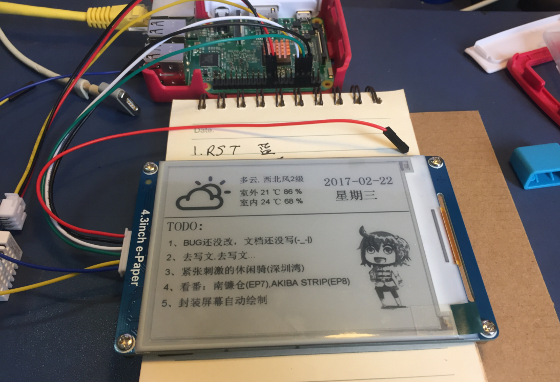 第二次是第一次拿到温湿度传感器和显示屏,第一次接触GPIO看说明书上的各种参数,完全不明白。经过慢慢的折腾明白了GPIO接口的大部分作用,然后又发现串口无法使用…,总之使用了一些折中的方案终于完成了基本的功能。之后的主要功能应该是在这个设备上集成一些数据聚合和分析功能,减少每天的知识收集时间,再就是做一些规划督促和帮助自己实现某些中长期目标,以及养成一些好的习惯。