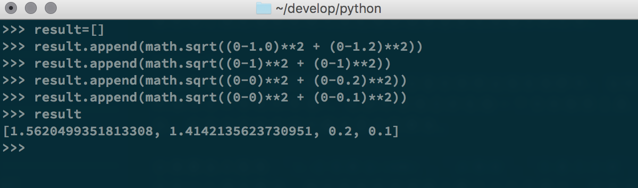 如上图非常直观的进行计算(顺便熟悉一下Python)代码,然后排序找出最短的距离再查表找到对应的点和其代表的类别就行了。