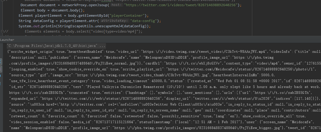 如图很快的发现了一条异步请求,其返回的是一个html代码片段。经过测试删除多余的参数获得一条原始链接“https://twitter.com/i/video/tweet/{tweet_id}”,这里会发现推文的ID确实是和作者无关的,其返回一段html文本,其中包含一个ID为"playerContainer"的div,并且其中包括一个叫"data-config"的属性,它的值是一个编码之后非常长的字符串。