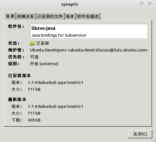 于是又在http://stackoverflow.com/找到了答案,首先到SVN官网找到最新的地址更新SVN插件,地址在http://subclipse.tigris.org/servlets/ProjectProcess?pageID=p4wYuA。按照自己需要招对应版本,于是我当时用的石最高版本1.8.x。但是1.8.x对应的java HL版本是1.7.x,这个在java HL主页有介绍,地址http://subclipse.tigris.org/wiki/JavaHL,但是这个1.7.x不再ubuntu的仓库里面。于是使用PPA源,命令如下