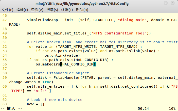 这时候一般都会报错,提示少目录之类的,大致这样 OSError: [Errno 2] 没有那个文件或目录: “/etc/hal/fdi/policy”,这时候需要新建一个目录,直接sudo mkdir -p /etc/hal/fdi/policy即可。然后石改一下py的配置文件。文件路径/usr/lib/pymodules/pythonx.x/NtfsConfig/NtfsConfig.py。这里pythonx.x可能会不同,我这里是2.7。将56行将”os.mkdir(HAL_CONFIG_DIR”:改为”os.makedirs(HAL_CONFIG_DIR)”,如下图:
