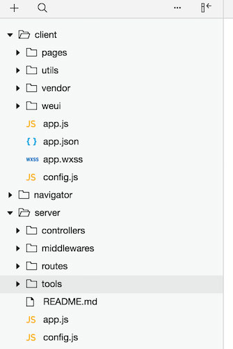 如果使用wafer2框架的话,整个小程序文件结构如上图,包括微信端小程序/client与服务端框架/sever。