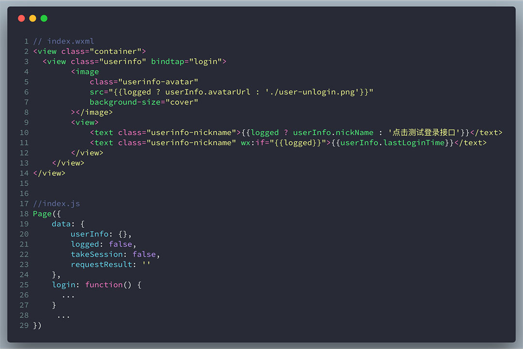 如上图即index页面的代码片段,这做简单的解释。bindtap属性类似于@click用于调用index.js中的login: function(){}。图片中src属性使用{{}}胡子语法用于声明这其中是JS代码段,常用于变量输出和多目运算。而其中的wx:if属性为条件渲染,即满足if条件才渲染此标签。同样的还有wx:elif和wx:else。