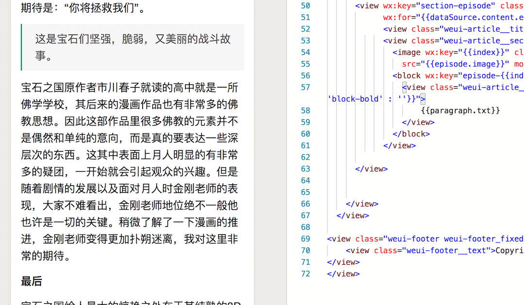 weui-article__p,这里包括普通段落,加粗段落和块段落。通过判断paragraph.type的值动态为view标签增加block-quote样式或者block-bold样式。 - 方法绑定:对于方法的绑定仅限于事件绑定,如